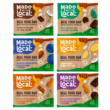 Made with Local Real Food Bar Peanut Butter Blondie: Oats, natural peanut butter, honey, peanuts, pumpkin seeds, organic milk chocolate (organic cocoa butter, organic cane sugar, organic cocoa mass, cream powder, organic raw cane sugar, skimmed milk powder, natural vanilla), sea salt. Made with Local Real Food Bar Blueberry Almond Butter: Oats, natural almond butter, honey, walnuts, dried blueberries (Nova Scotia blueberries, sugar), walnuts, cinnamon. Made with Local Real Food Bar Coconut in the Dark: Oats, natural peanut butter, honey, fair trade organic coconut, fair trade organic dark chocolate (cacao mass, cane sugar, cacao butter), pumpkin seeds, sea salt. Made with Local Peanut Butter Brownie Real Food Bar: Organic oats, natural peanut butter, sugar (honey), organic cocoa, organic dark chocolate (cocoa mass, cane sugar, cacao butter), peanuts, sea salt. Made with Local Mint Chocolate Chip Real Food Bar: Organic gluten-free oats, cashew butter, honey, organic dark chocolate (cacao mass, cane sugar, cacao butter), organic fair trade cocoa powder, walnuts, sea salt, pure peppermint oil. Made with Local Real Food Bar Lemon Square: Gluten free oats, Cashew butter, Sugar (honey), Organic coconut, Walnuts, Pure lemon oil, Sea salt. Contains tree nuts (cashew, walnut). May contain peanuts.