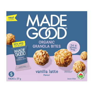 MadeGood Organic Granola Bites Vanilla Latte flavour is nut & gluten free and a source of fibre.