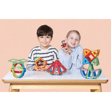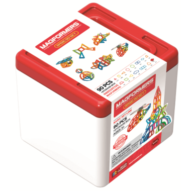The 90 piece set includes Magformers shapes in a convenient storage bucket that is perfect for playrooms and schools.  In addition to the basic geometric shapes, it also includes curved pieces like sectors, arches and super arches to expand building possibilities.  Includes a 3D modeling guide and a full scale placement map.