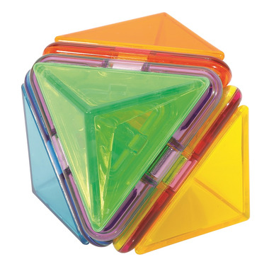 This cool new set includes 14 Magformers shapes (8 triangle, 6 square), plus 14 3D plastic inserts (8 triangular pyramid, 6 square pyramid) to help children learn about spatial perception. The lid of the box lifts open to feature a magnet-friendly board on the inside flap. This allows you to build different creations and attach them to the lid. Also includes a 39-page idea booklet .