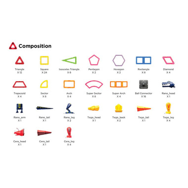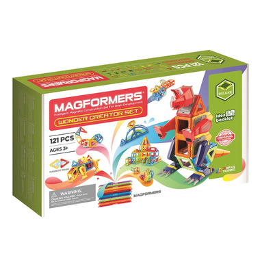 Magformers greatest Wonder Creator Deluxe set. ROAR! your ideas to life with this epic Magformers Dino set. Use 121 Pieces including magnetic shapes and accessories to build the ultimate Dino friends! You won't believe your eyes when you transform a T-rex into a Stegosaurus! This set is simply out of this world!