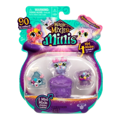 The Magic Mixies Minis 4 Pack includes a total of 4 Mini toy figures, featuring 1 Mini Mixie concealed within a mini Cauldron.
