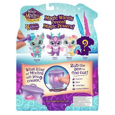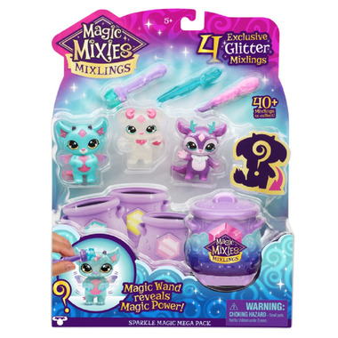 Get ready to make real magic and discover the world of Magic Mixies Mixlings, a cute new breed of Magic Mixies for you to conjure up! The Sparkle Magic Mega Pack includes 4 Mixlings with an exclusive sparkly finish plus one mystery sparkly Mixling in the included Cauldron. Who will you find inside? Each Mixling in the Sparkle Magic Mega Pack has a different magical power that is revealed with the 3 included magic wands.