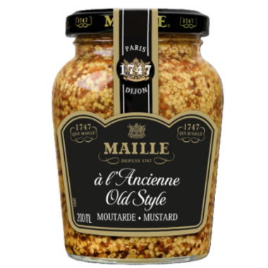 Maille Old Style Mustard. With its notes of hazelnut, crunch mustard seeds, intense flavours and subtle notes of white wine. This delicious mustard is perfect with herbed lamb chops. Add to your favourite vinaigrette to enliven the flavours or boost the flavour of cheese toasts.
