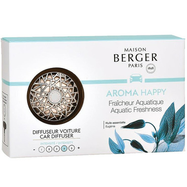 Freshen stale car air with the Maison Berger Car Diffuser - Happy Aquatic Freshness from the Aroma Collection. The starter kit includes a metallic car diffuser with a plastic clip to secure onto your car's air vent, plus a scented ceramic tablet. Diffusion lasts approximately 4 weeks.