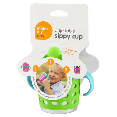 The Make My Day Adjustable Sippy Cup, make from stainless steel and food- grade silicone, easily changes into 3 different cups to suit your child's stage of life.