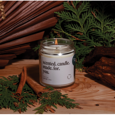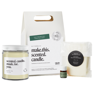 Make This Universe's DIY Scented Soy Candle Kit comes with all the tools, ingredients and instructions you need to create your own 4oz scented soy candle, with a burn time of 20 hours. This Holiday fragrance- Cedarbark & Spice- is all about evoking the scent of a festive Holiday morning- with notes of Cedar, cinnamon and sandalwood.