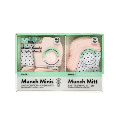 Munch Mini Combo includes Malarkey Kids' revolutionary Munch Mini mitts for anti-scratch/teething for 0-3months and the trademark Munch Mitt for teething babies 3-7months.