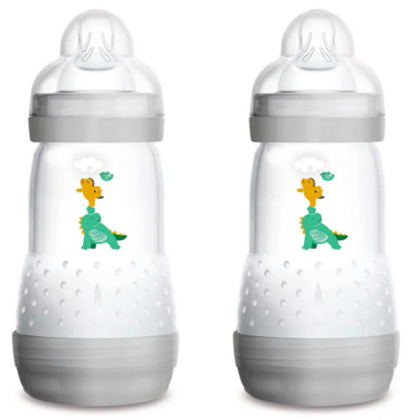 MAM Easy Start Bottle 9 oz (2-Count). A medium flow bottle with silicone nipples. For ages 2+ Months and Unisex.