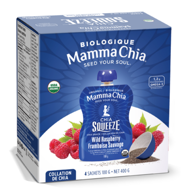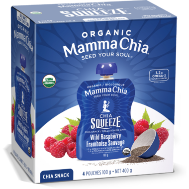 Mamma Chia Organic Chia Squeeze Wild Raspberry is a vitality snack that has no added sugar, 1200 mg of omega-3 and 70 calories per serving.