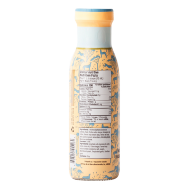 Vegetable oils, (canola oil, extra virgin olive oil), cider vinegar, Tamari soy sauce (water, soybean, salt, sugar) Nutritional yeast, Dehydrated garlic, Xanthan gum.