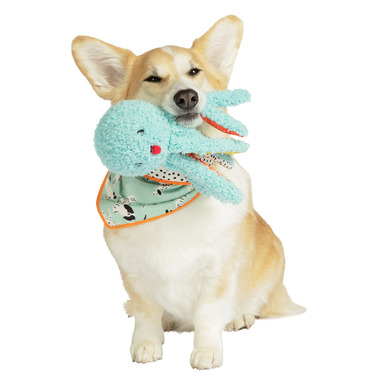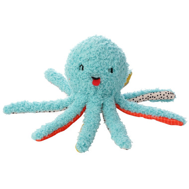 Oddball Olga Octopus dog sensory toy has delightful blue fabric covering the squeaker ball, accompanied by eight multi-colored tentacles, creating a treasure trove of excitement for your fur-baby; measures 13 inches in height with tentacles dangling and head is 4 inches in diameter.
