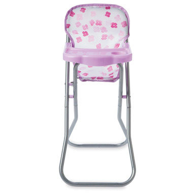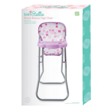 It's feeding time Baby Stella! The collapsible Blissful Blooms High Chair has a metal frame, fabric seat and plastic tray that lifts and lowers. Baby Stella collection of soft dolls and accessories encourage nurturing skill development through role play.