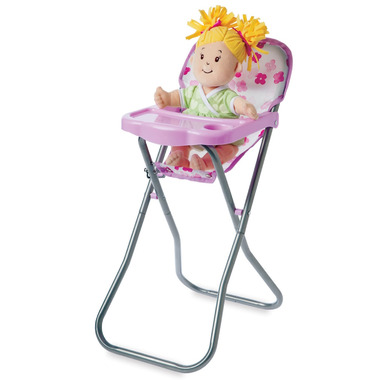Have fun feeding Baby Stella with this Highchair Doll Accessory! The chair has a metal frame, fabric seat and plastic tray that lifts and lowers.
