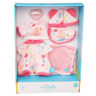 Baby Stella's Welcome Home collection is a recommended first change of clothes for bringing home Baby Stella.The perfect collection of accessories for bringing home baby. This six piece doll accessory set includes: hat, bib, onesie, cardigan, magnetic pacifier and patterned blanket. Light pink fabric with hot pink trim has floral patterns and notable bunny graphics on the bib and cardigan.