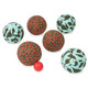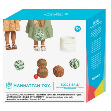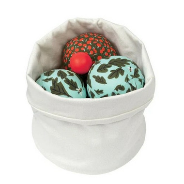 A bocce ball game in kid-size. Set includes 6 patterned memory foam balls (3 cherry; 3 leaves), 1 red target ball, and 1 cloth basket for storage. Toss the red target ball. Players take turns tossing their patterned balls towards the target ball. Land your ball closest to the target to win. Store indoors when not in use. Active fun that doesn't need batteries or technology, just two players.