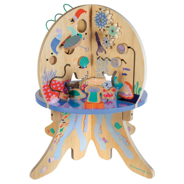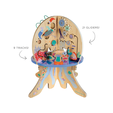 This wood activity center is packed full of exciting features! Includes 4 quadrants in the shape of a jellyfish with a variety of activities for baby: gliders, bead runs, spinning gears, springy coral, clacking clams and peek a boo mirror. Adult assembly required.
