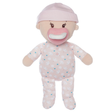 The Love, Stella dolls are the perfect size for holding, hugging, and nurturing role-play to foster social and emotional development. My First Love, Stella dolls are 100% soft with a sewn-on onesie, removable hat, and a signature magnetic pacifier design. Their bald heads are slightly weighted with embroidered facial features. Their squishy-soft body has a lightly weighted bottom and sits unassisted.