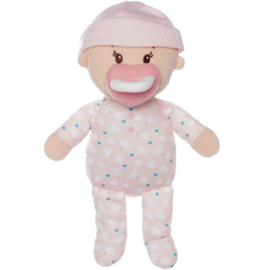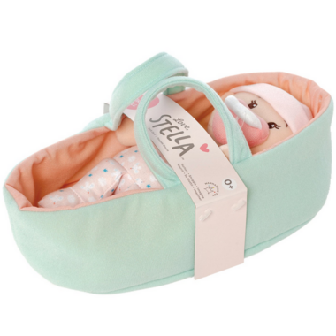 The Love, Stella dolls are the perfect size for holding, hugging, and nurturing role play to foster social and emotional development. My First dolls are 100% soft with a sewn-on onesie, removable hat, and a signature magnetic pacifier design. Their bald heads are slightly weighted with embroidered facial features. Their squishy-soft body has a lightly weighted bottom and sits unassisted. This adorable set comes with a soft bassinet to encourage caring for this delightful baby doll.