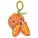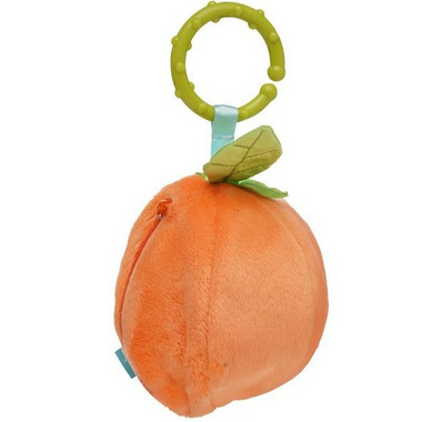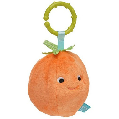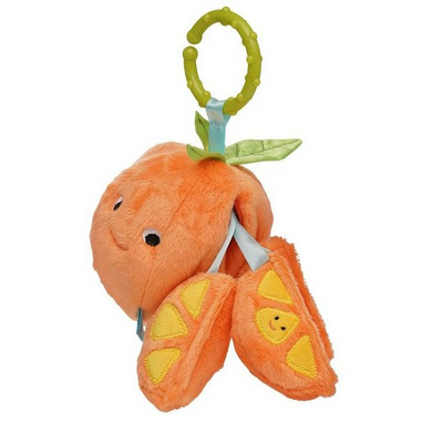 Fruity fun for little ones on the go! This orange travel toy has embroidered facial features and a zippered compartment that holds three soft fabric orange slices. Tethered by silky-soft ribbons, each slice include three unique features - rattle, squeaker and crinkle textures. It easily attaches to carriers, strollers, cribs and more with its textured plastic C-clip that doubles as a teether. Great for on-the-go play while encouraging motor development and cause and effect learning.
