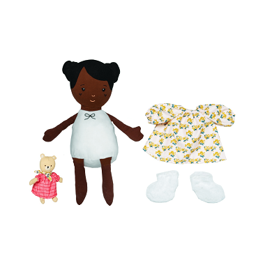 This machine washable soft doll Harper is the perfect playtime friend with a a built-in onesie, removable shoes, and little bear companion! Have a play date with Harper and her little bear friend! Harper features a built-in onesie with whimsical bow design and removable outfit and shoes.