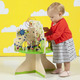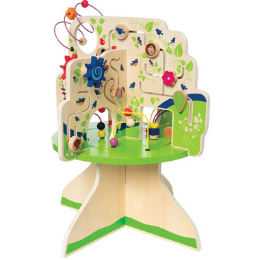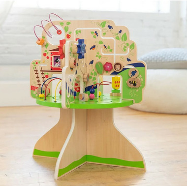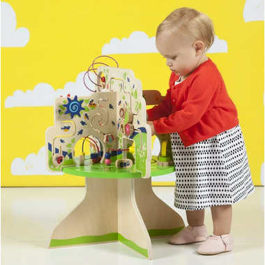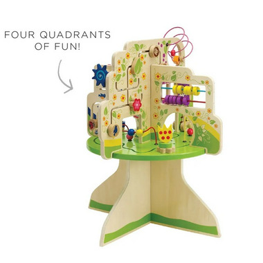 This wooden activity center is packed full of exciting features! Includes 4 quadrants with a variety of activities: 6 tracks with animal-themed gliders, 6 bead runs with colourful wooden beads, a spring flower and more. Adult assembly required.