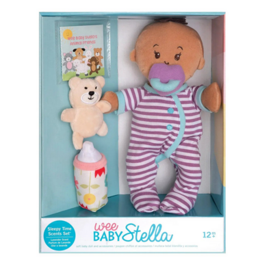 Soothing scents and sleepy attire, the Sleepy Time Scents set is the perfect cuddle companion for your little one. This bed time themed set features scent technology by Celessence, an innovative micro-encapsulation delivery system - gently hug doll to release her soft lavender scent. This Sleepy Time set comes with a Wee Baby Stella Beige doll, magnetic bottle, soft bear and paper storybook. The 12 inch Wee Baby Stella dolls are completely soft and beautifully crafted with details such as a belly button and perfectly plump tummy.
