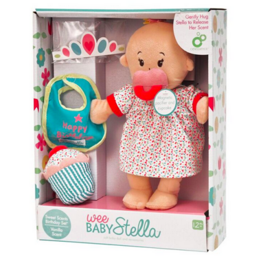 Happy Birthday Baby! This vanilla scented birthday set comes with a Wee Baby Stella peach doll, paper tiara, pretend cupcake and happy birthday bib with Velcro-like closure. This 12 inch Wee Baby Stella doll has the same lifelike features as regular 15 inch Baby Stella. This birthday themed set features scent technology by Celessence, an innovative micro-encapsulation delivery system - gently hug doll to release her vanilla scent. Winner of a National Parenting Product Award (NAPPA).