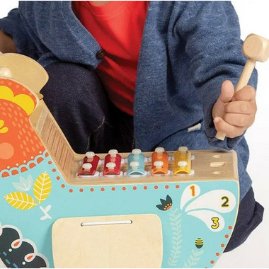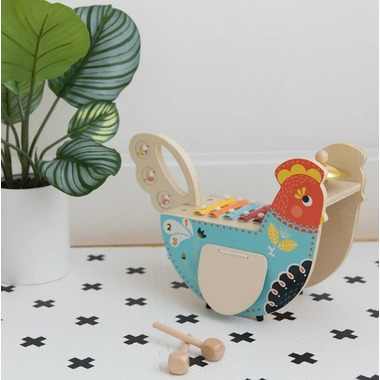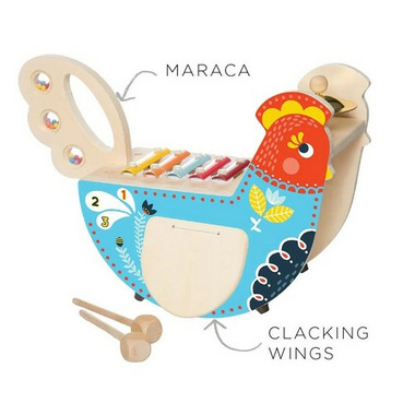 Get your jam on! The Musical Chicken is loaded with musical fun! Features five instrument attachments and activities to keep little ones busy. Musical instruments include: 1 cymbal, 5-bar xylophone, 1 maraca tail, 2 clacking wings that double as drums with mallets that store back by the tail. Parents editors named it Best Musical Toy Best of Toy Fair. The whole thing is cute enough to leave sitting out for all to see.