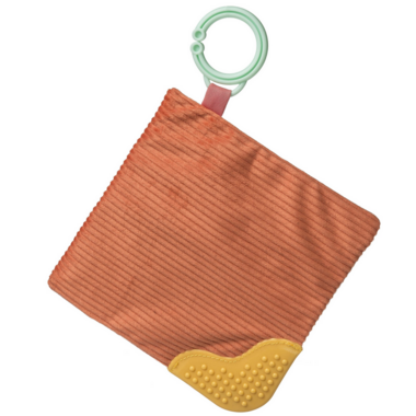 A true standalone item part soother, part activity toy. A soothing activity toy for curious babies. Simple activity toy with sewn in teether and embroidery. Each Crinkle Teether has fun character appliques and colourful patterns. Baby safe embroidered details. Machine Washable.