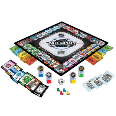 Puck drop! Choose from all 31 NHL teams to create your custom playing piece with our reusable, static-cling stickers. Just peel and stick the logo stickers of your favorite teams, and youΒre ready to hit the ice! Get ready for NHL Face-Off, collect key positions, equipment, and players as you go around the board. Make trades during NHL Scouting CombineTM and NHL Draftٙ, and collect groups of the same color to earn more money. Just be sure to avoid the Penalty Box! Go to the Stanley Cup Final and win big with NHLή-OPOLY JUNIOR!