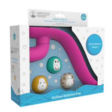 The Matchstick Monkey Bathtime Slide Set is the perfect baby bath toy that encourages hand-eye coordination with 1 slide & 3 fun animal character rocks that roll down into the water.