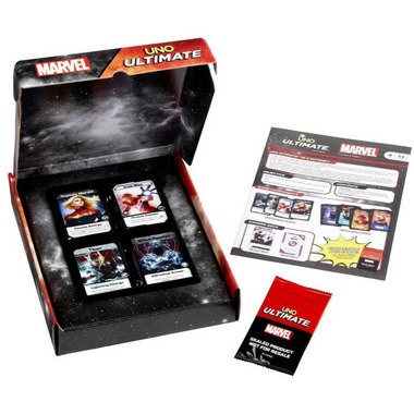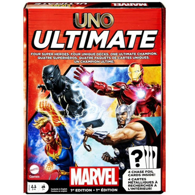 With this UNO Ultimate card game, players may not be Marvel Superheroes, but they can play like they are! This premium version of UNO features four card decks, each designed specifically for a popular, heroic character. Each player chooses to play as a character who has special powers that they can use on EVERY turn. A Danger Deck holds "Event" and "Enemy" cards to switch the balance of power! Players race to get rid of all their cards just like the classic UNO game, and they can't forget to yell "UNO!" when down to their last one. Unique to UNO Ultimate are TWO ways to win each round as well as four collectible, never-before-seen Foil Cards which players can keep and collect or put in the game itself to spice up the Ultimate deck! The card game makes a great gift for fans of UNO, Marvel and fun on game night. Colours and decorations may vary.