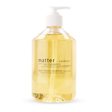 Matter Company Body Wash Shampoo is a gentle, invigorating wash for body and hair. It's biodegradable, and preserves the skin's natural oils. It also strengthens hair and skin. Take it camping, wash your dishes with it, too!