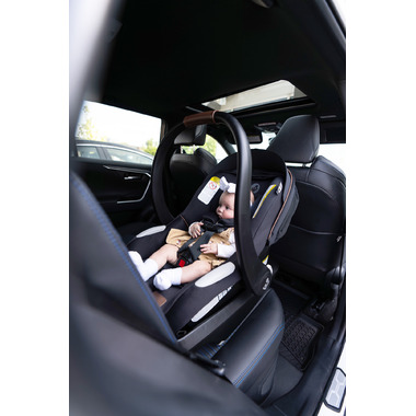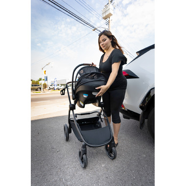 The ClimaFlow technology shell provides added ventilation to keep your baby cooler. Side impact protection and plush padding on the removable infant head and lumbar inserts ensures a secure fit and cozy ride. Plus, energy absorbing EPP environmentally-friendly foam in the headrest area to effectively manage impact energy. The extendable ventilated canopy provides maximum shade and airflow. Enjoy added style and comfort with the vegan leather-trimmed ergonomic carrying handle contoured to curve around your hip.