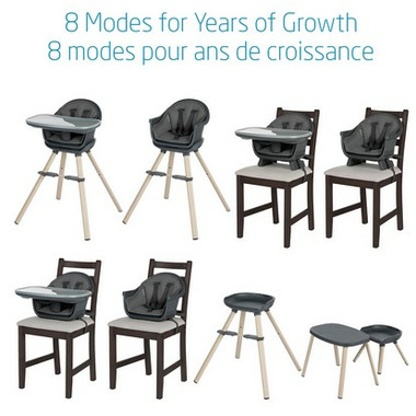 - 8 modes of use: Infant High Chair, Toddler High Chair, High Feeding Booster, High Booster Seat, Low Feeding Booster, Low Booster Seat, Low Stool and Table, Stool