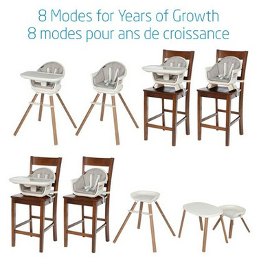 - 8 modes of use: Infant High Chair, Toddler High Chair, High Feeding Booster, High Booster Seat, Low Feeding Booster, Low Booster Seat, Low Stool and Table, Stool