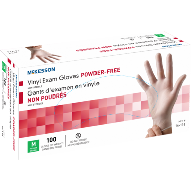 McKesson vinyl exam gloves comfortable fit helps deliver high performance with a polymer coating. Powder-free, they help minimize the absorption and transfer of irritants and allergens. Healthcare professionals can easily don the gloves in both damp and dry conditions.