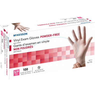 McKesson vinyl exam gloves comfortable fit helps deliver high performance with a polymer coating. Powder-free, they help minimize the absorption and transfer of irritants and allergens. Healthcare professionals can easily don the gloves in both damp and dry conditions.