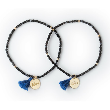 In Swahili, the word for friend is rafiki. This set of two black beaded friendship bracelets comes on perforated packaging you can tear in half to share with your bestie! Each bracelet has a brass ""Believe"" charm and a blue tassel.