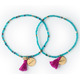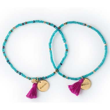 In Swahili, the word for friend is rafiki. This set of two teal beaded friendship bracelets comes on perforated packaging you can tear in half to share with your bestie! Each bracelet has a brass "Growth" charm and a bright magenta tassel.