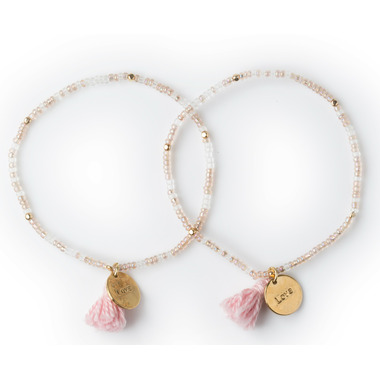 In Swahili, the word for friend is rafiki. This set of two pink beaded friendship bracelets comes on perforated packaging you can tear in half to share with your bestie! Each bracelet has a brass ""Love"" charm and a pink tassel.