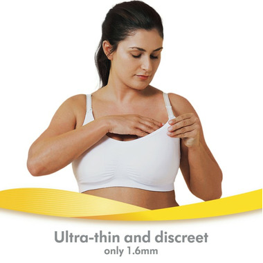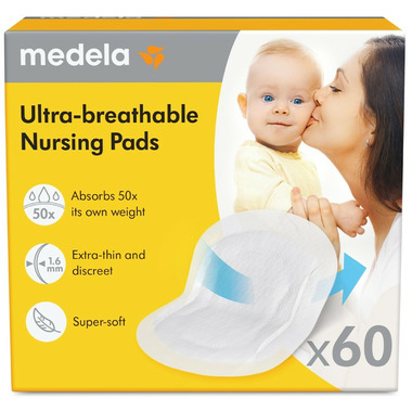 Medela Ultra-Breathable Nursing Pads Boasting a triple-layered polymer core that absorbs 50 times its weight, these pads ensure day and night dryness. The waterproof back layer and flexible leak guards help absorb milk leakage to protect your clothing. Crafted for optimal air circulation, the ultra-breathable outer layer prevents unwanted moisture build-up, keeping you dry, comfortable, and fresh around the clock. With a contoured design at just 1.6mm thin, these pads discreetly mold to your body, eliminating discomfort and bulges. Soft as a mother's touch, the honeycomb lining provides delicate feel, and the pads are hypoallergenic and dermatologically tested. Individually wrapped for cleanliness, these pads are your on-the-go companions ֖ compact, portable, and easy to use.