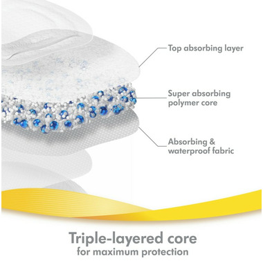 - MAXIMUM ABSORBENCY: Triple-layered polymer core absorbs 50x its own weight, ensuring day and night dryness. The waterproof back layer and flexible leak guards help absorb milk leakage to protect your clothing.