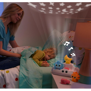 Toddlers can build healthy routines with the Rise & Snooze Night Light including 4 characters. They can get ready for bedtime by placing the moon block on the night light to create a soothing ambience with lullabies, soft sounds, and light effects including a star light projector. In the morning, they can swap the moon for the sun to start the day with upbeat songs, ambient sounds, and sunny light patterns.