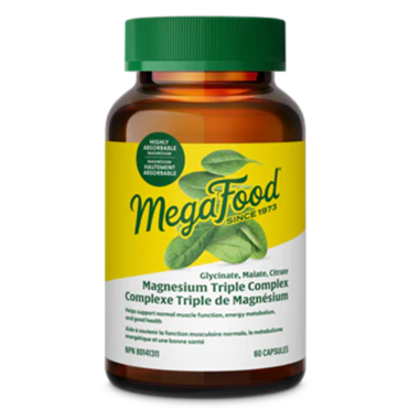 MegaFood's most potent Magnesium complex to support a normal stress response, normal sleep cycle, blood pressure, and muscle function. Magnesium Triple Complex contains several synergistic forms of magnesium: magnesium malate, magnesium citrate & magnesium glycinate. Also includes 50 mg of organic spinach per serving Magnesium is critically important for hundreds of different functions in the body, such as helping ease muscle tension. Formulated to be gentle and effective