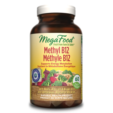 MegaFood Methyl B12 supports energy metabolism. This formula contains methylated forms of folate and B12, as well as the active form of Vitamin B6 that helps maintain healthy levels of homocysteine.