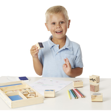 Animal lovers, here's the stamp set for you! Mix and match the detailed stamps with images of wild and domestic animals from land and sea, to create hundreds of beautiful scenes. All the pieces, including 16 stamps, 7 colored pencils and a durable inkpad, store in the sturdy wooden box. Washable, non-toxic kid-friendly ink.