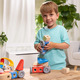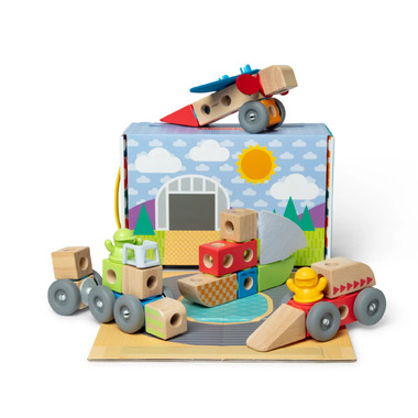 Melissa & Doug Blockables™ are connectable, stackable, and playable! The solid wood connect-and-play building blocks are perfect manipulatives to help preschoolers two and older boost developmental skills (fine motor, problem-solving, matching, storytelling, and self-esteem), while using their imaginations and having fun. Easy-to-grasp smooth, colorful wooden blocks fit together in a snap with large connectors that even little hands can push in and pull out. An illustrated guide shows how to arrange and link the Blockables to create multi-textured "things that go" (a sailboat with felt sail, airplane with felt propeller and wings, tractor with trailer, and race car), or kids can use their imaginations to mix, match, and combine pieces to make unique creations and play their own way! Kids can easily expand their collection -- the 54-piece Vehicles Play Set is compatible with all other Blockables play sets. The packaging folds out to convert into a fun play space and pieces store in the sturdy corrugated box with a soft handle for easy cleanup and portability.