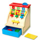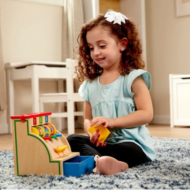 This wooden cash register adds a clever educational spin to a classic pretend-play toy! Press the number buttons to see different counting pictures, then "pay" for the purchase with numbered coins to match the quantities. The coins vary in diameter and thickness, so the 1 coin will only fit in the 1 slot, 2 in 2, and 3 in 3 . . . all situated right above the scroll of pictures with quantities to match. For extra "just like Mom and Dad" fun, kids can swipe a toy credit card too!